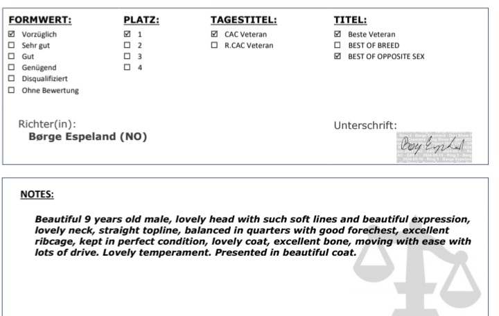 NEMO - Jewelhope New Day Rising startet nach fast 5 Jahren wieder an einer Ausstellung, gewinnt die Veteranenklasse mit dem VetCAC, wird Bester Veteran der Rasse und Best Of Opposite Sex.