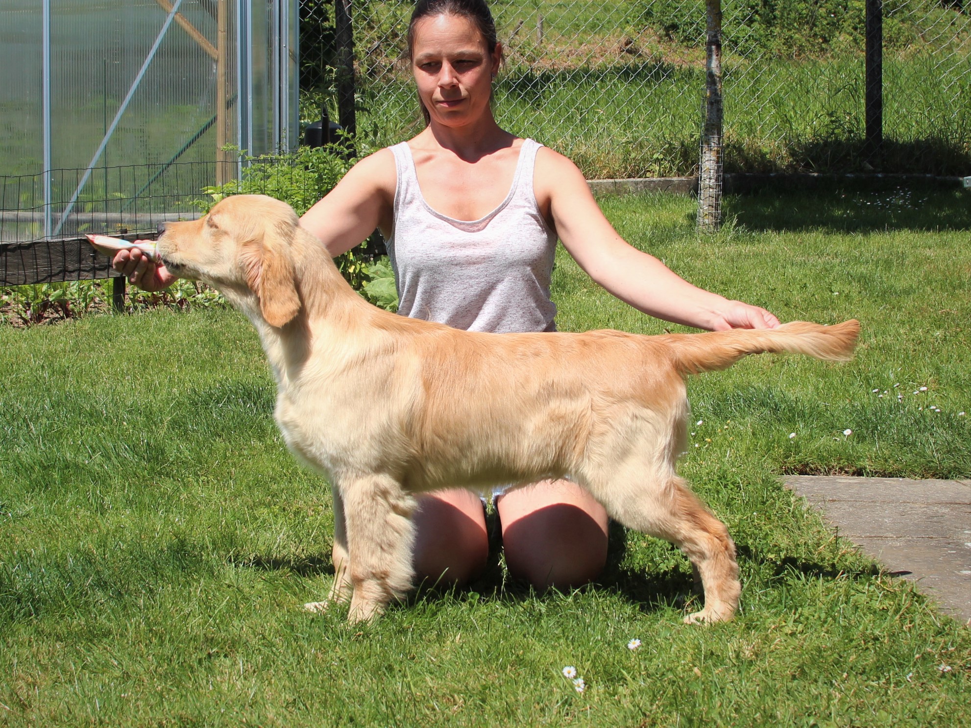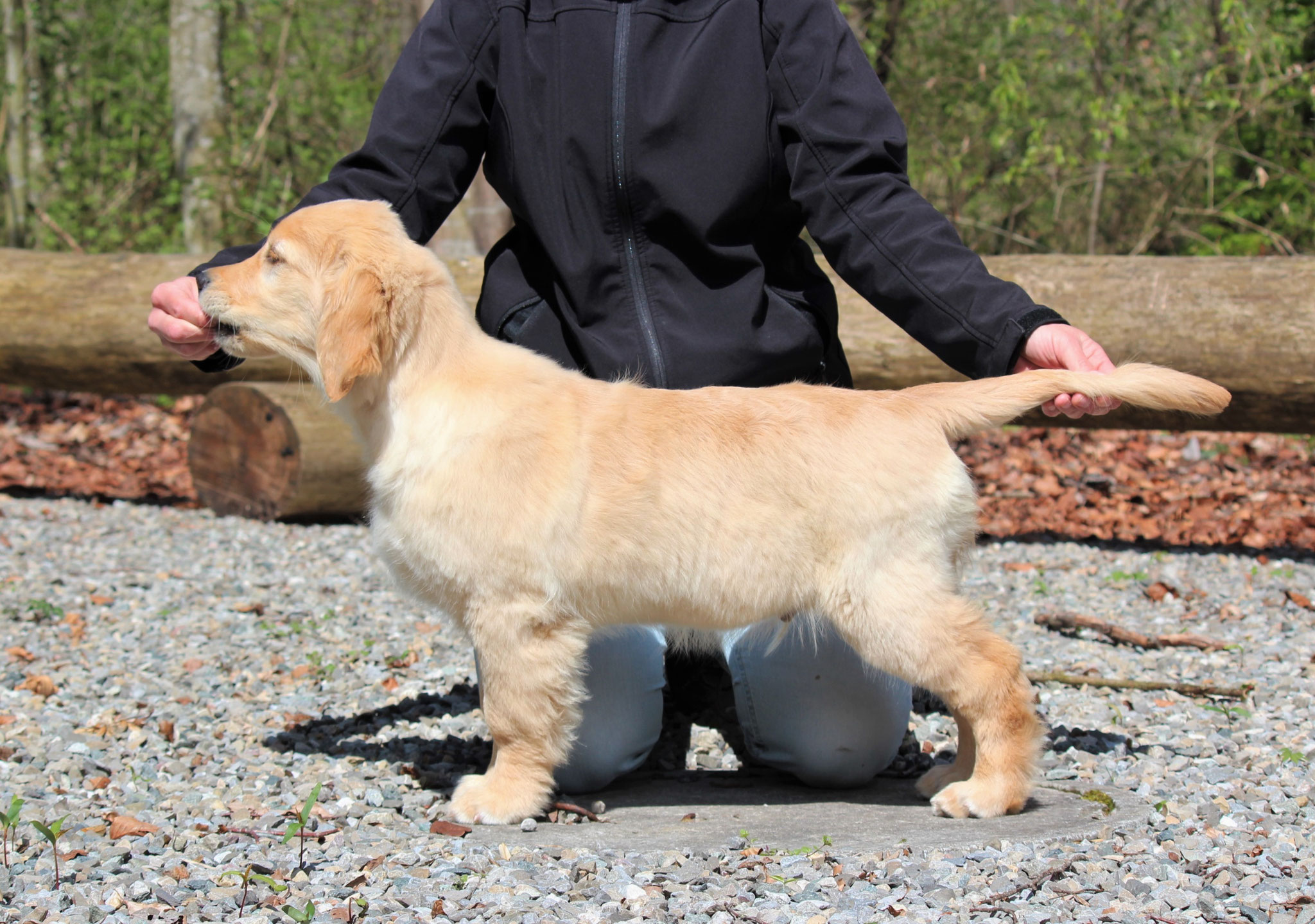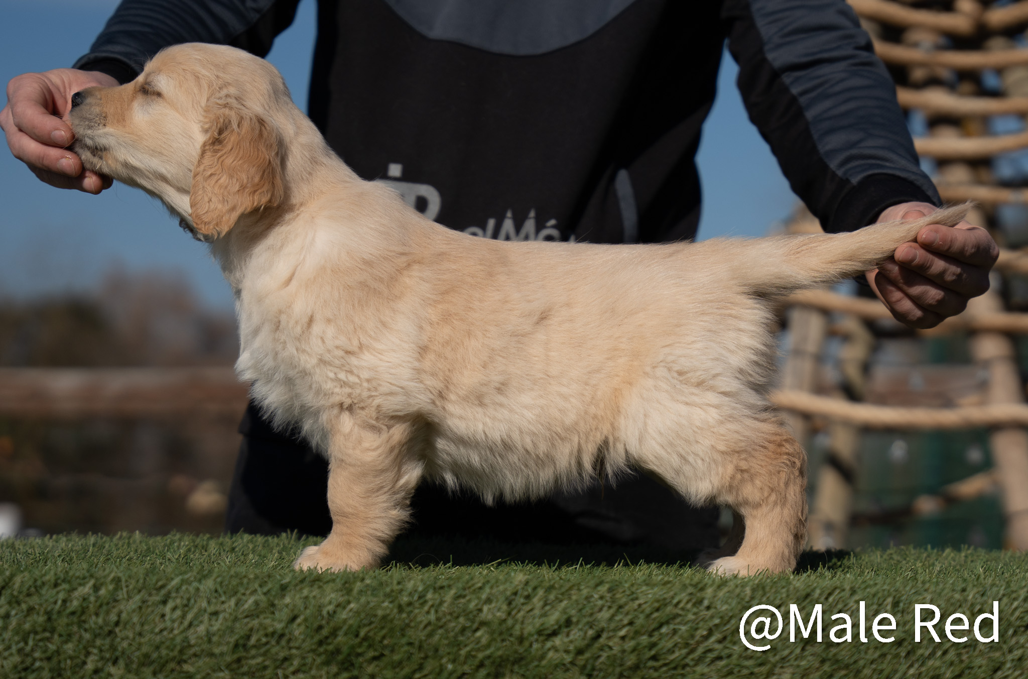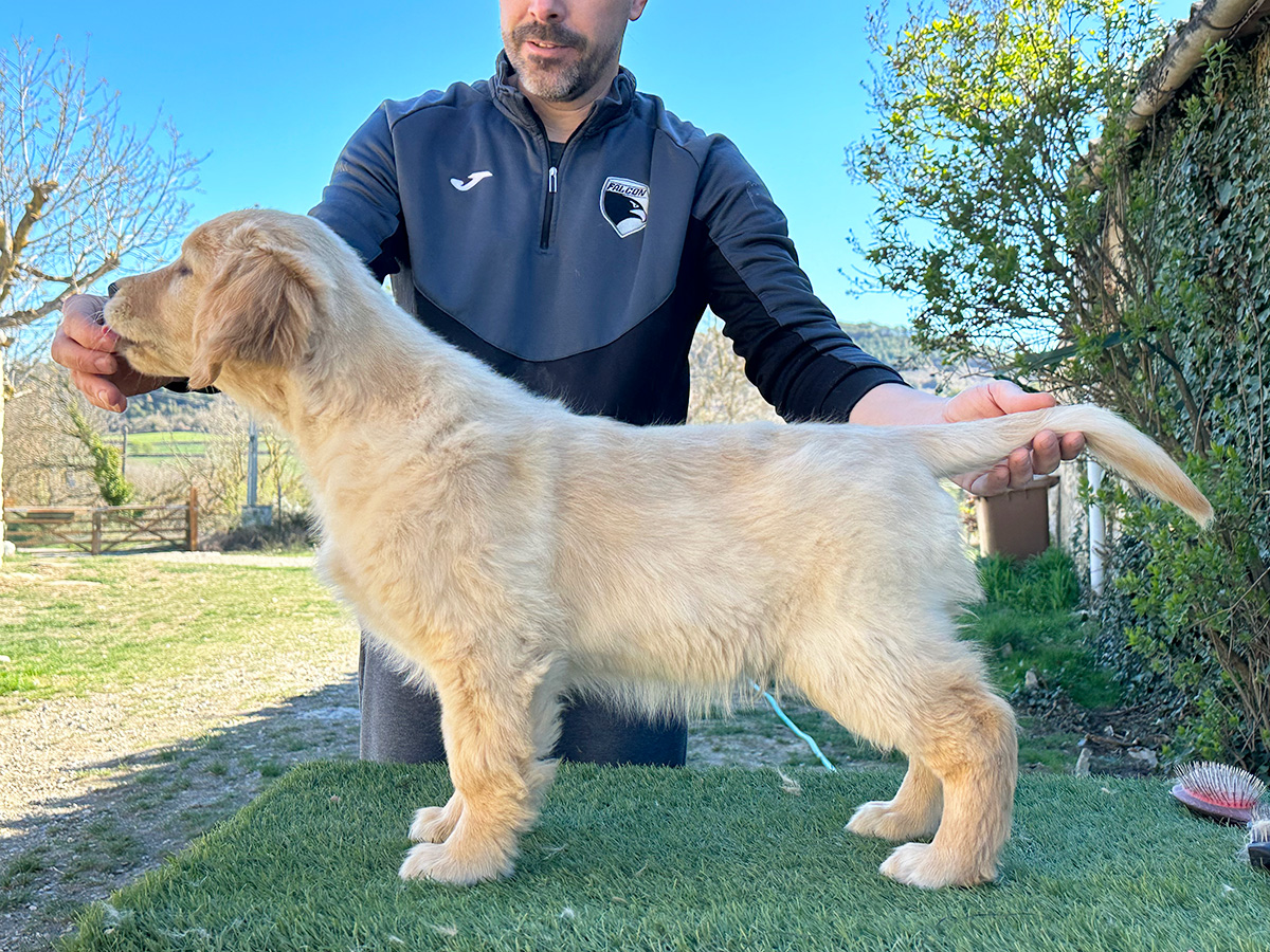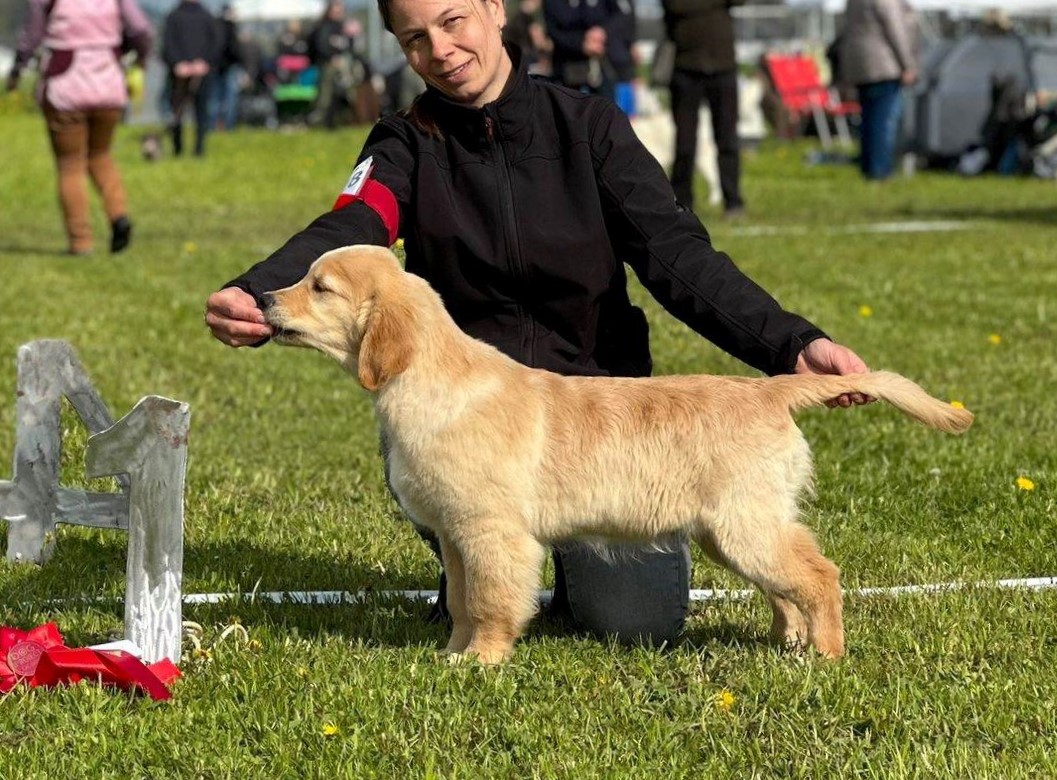 18 Monate alter goldfarbener grosser Rüde, maskuliner Kopf, breiter tiefer Fang, kräftiges Pigment, trockener Hals, ausgezeichnete Oberlinie, korrekte Rippenlage, tiefer Brustkorb, kräftige etwas lange Lende, gerade Läufe, sehr gute Knochenstärke, vorzügliche Winkelungen, aufmerksamer lebhafter Rüde in sehr gutem Haarkleid.