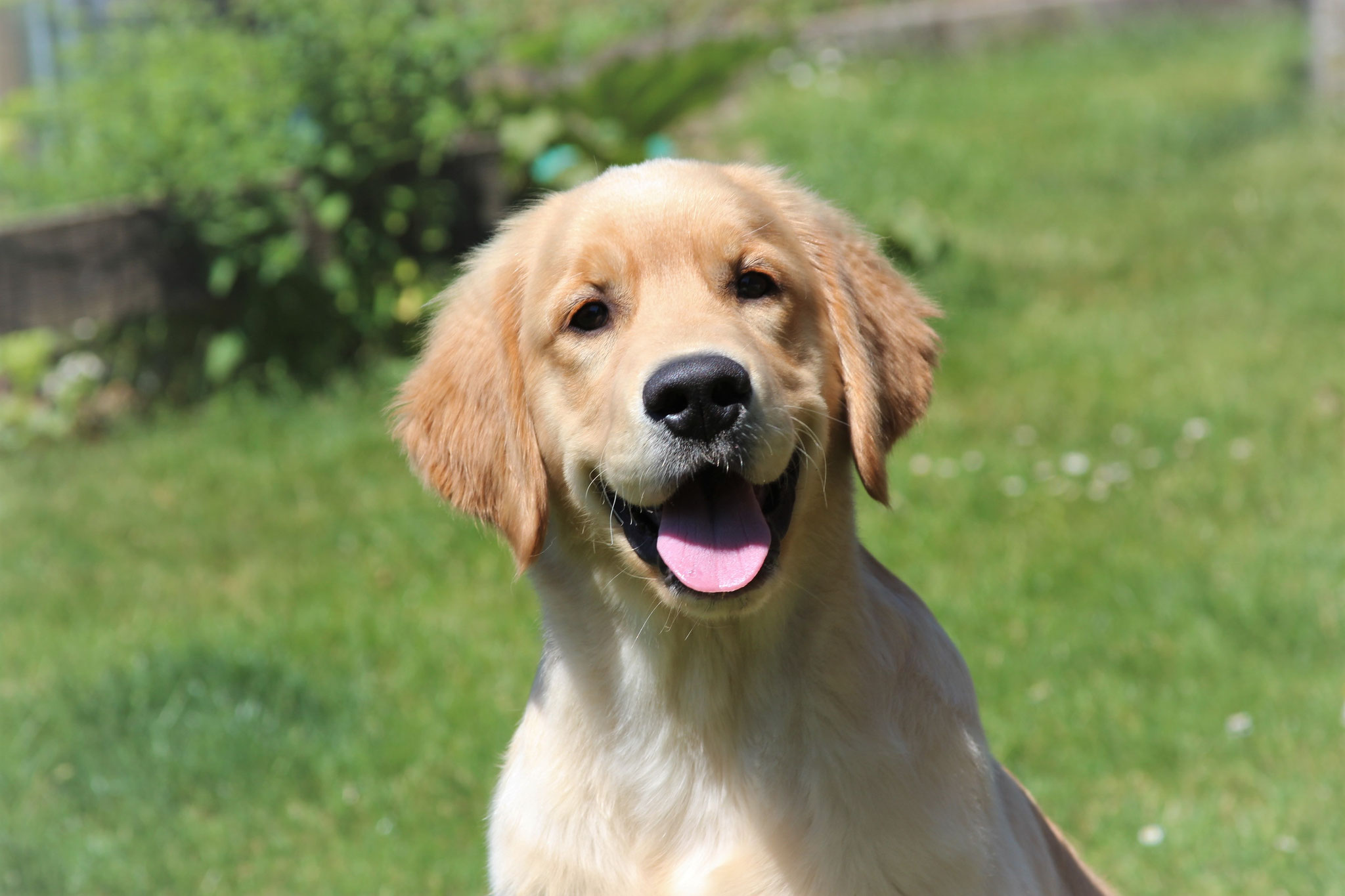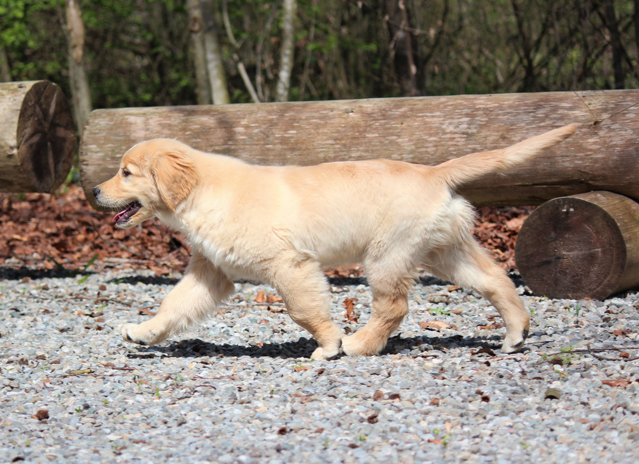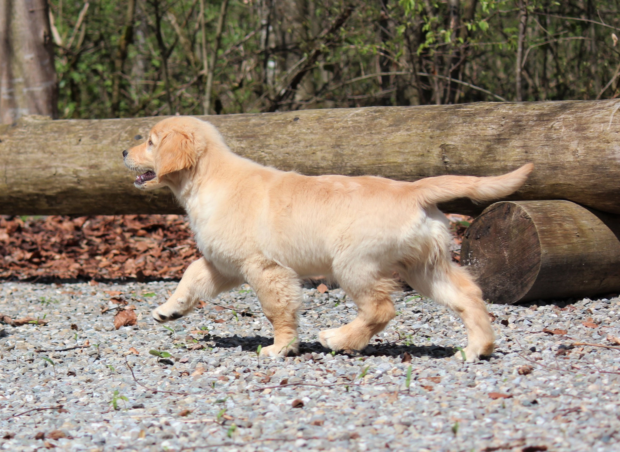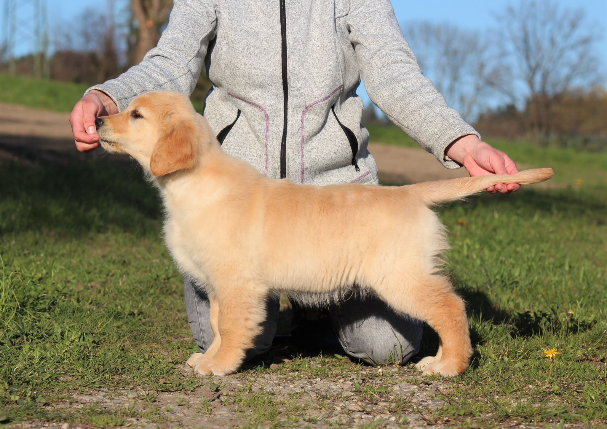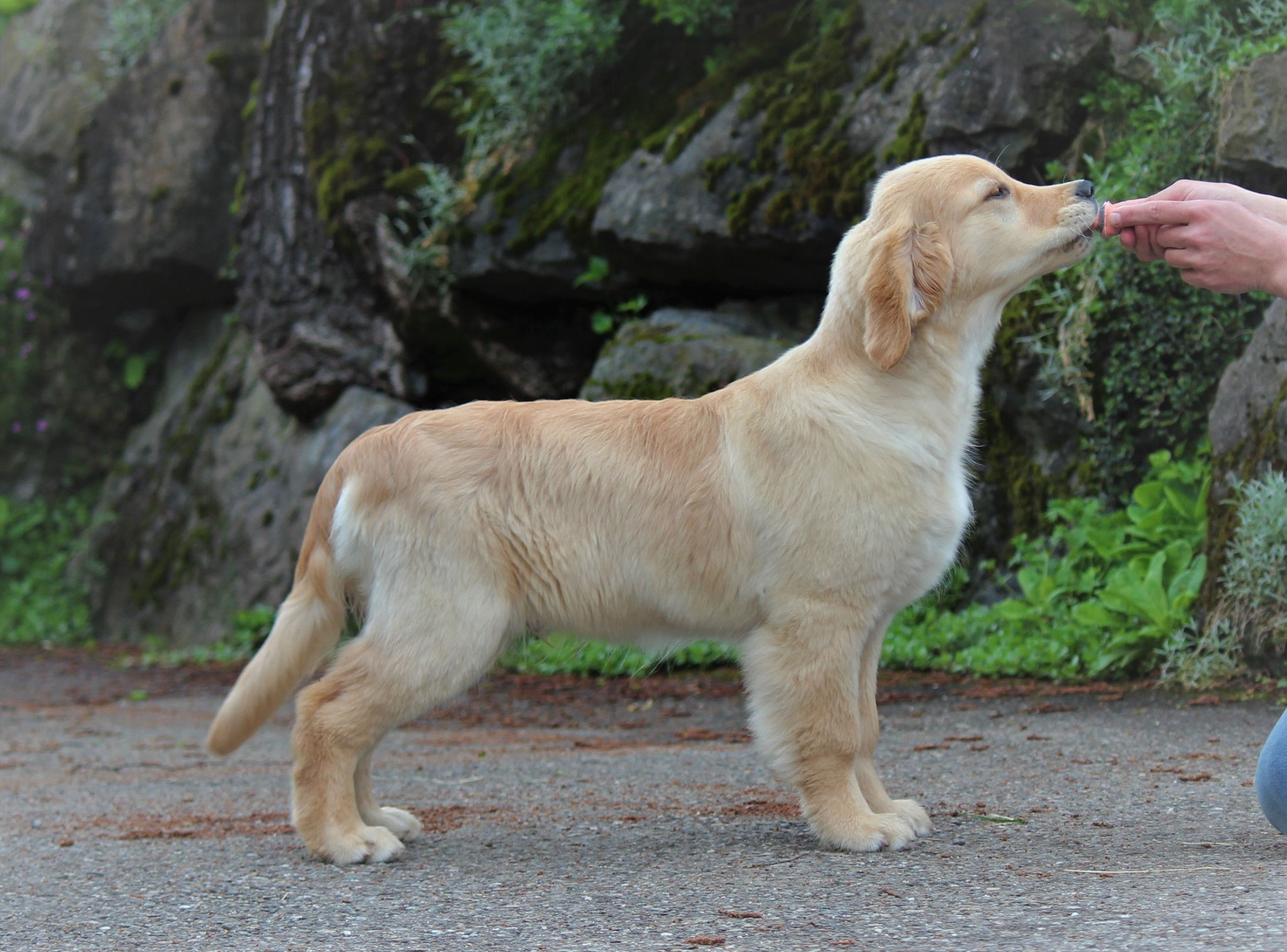 18 Monate alter goldfarbener grosser Rüde, maskuliner Kopf, breiter tiefer Fang, kräftiges Pigment, trockener Hals, ausgezeichnete Oberlinie, korrekte Rippenlage, tiefer Brustkorb, kräftige etwas lange Lende, gerade Läufe, sehr gute Knochenstärke, vorzügliche Winkelungen, aufmerksamer lebhafter Rüde in sehr gutem Haarkleid.