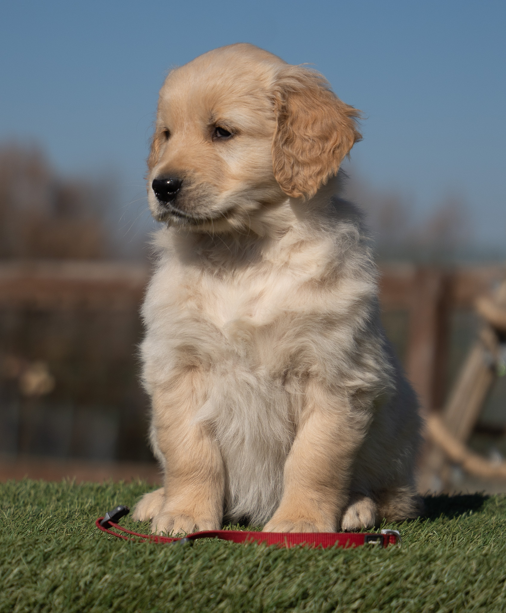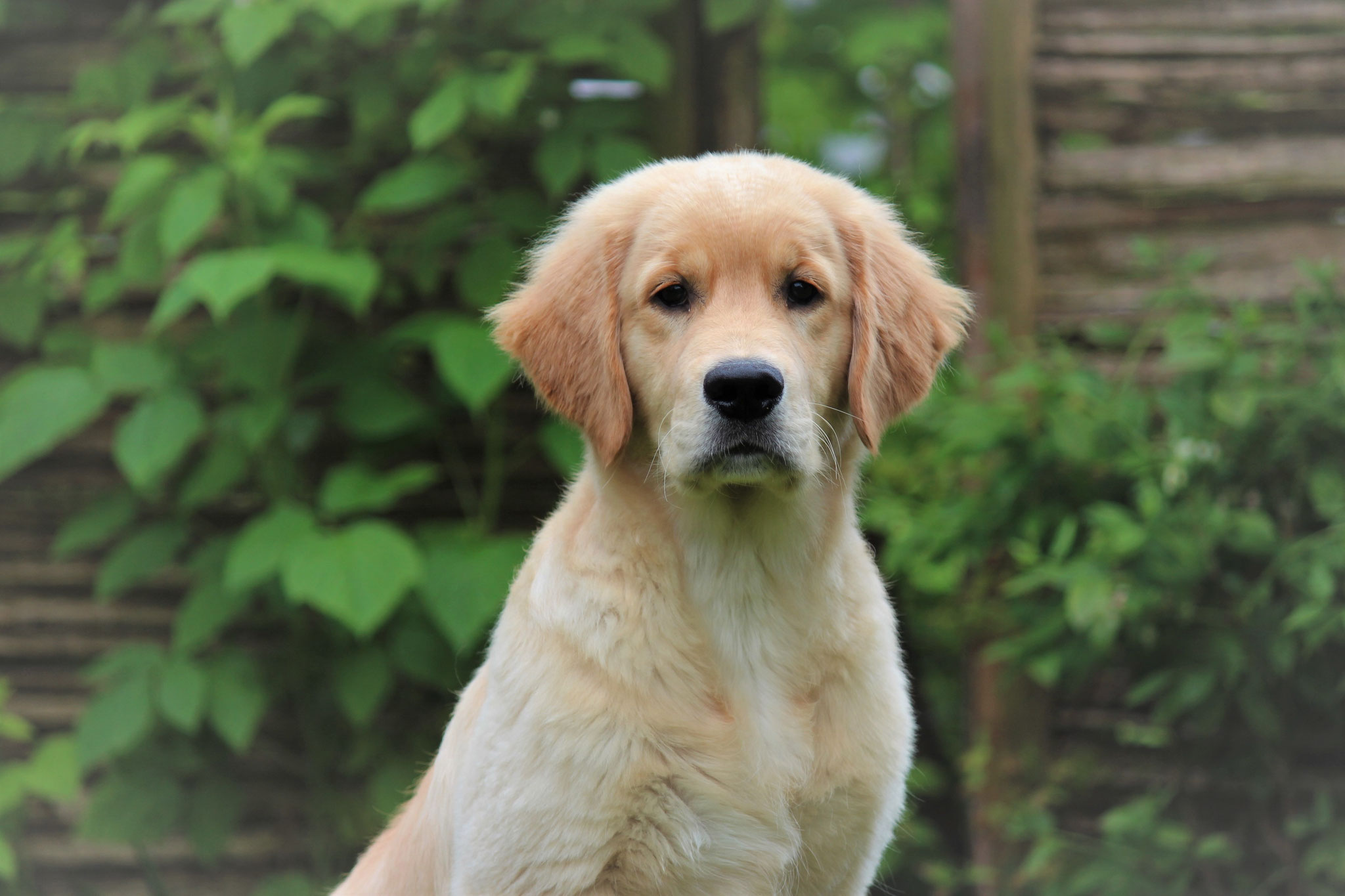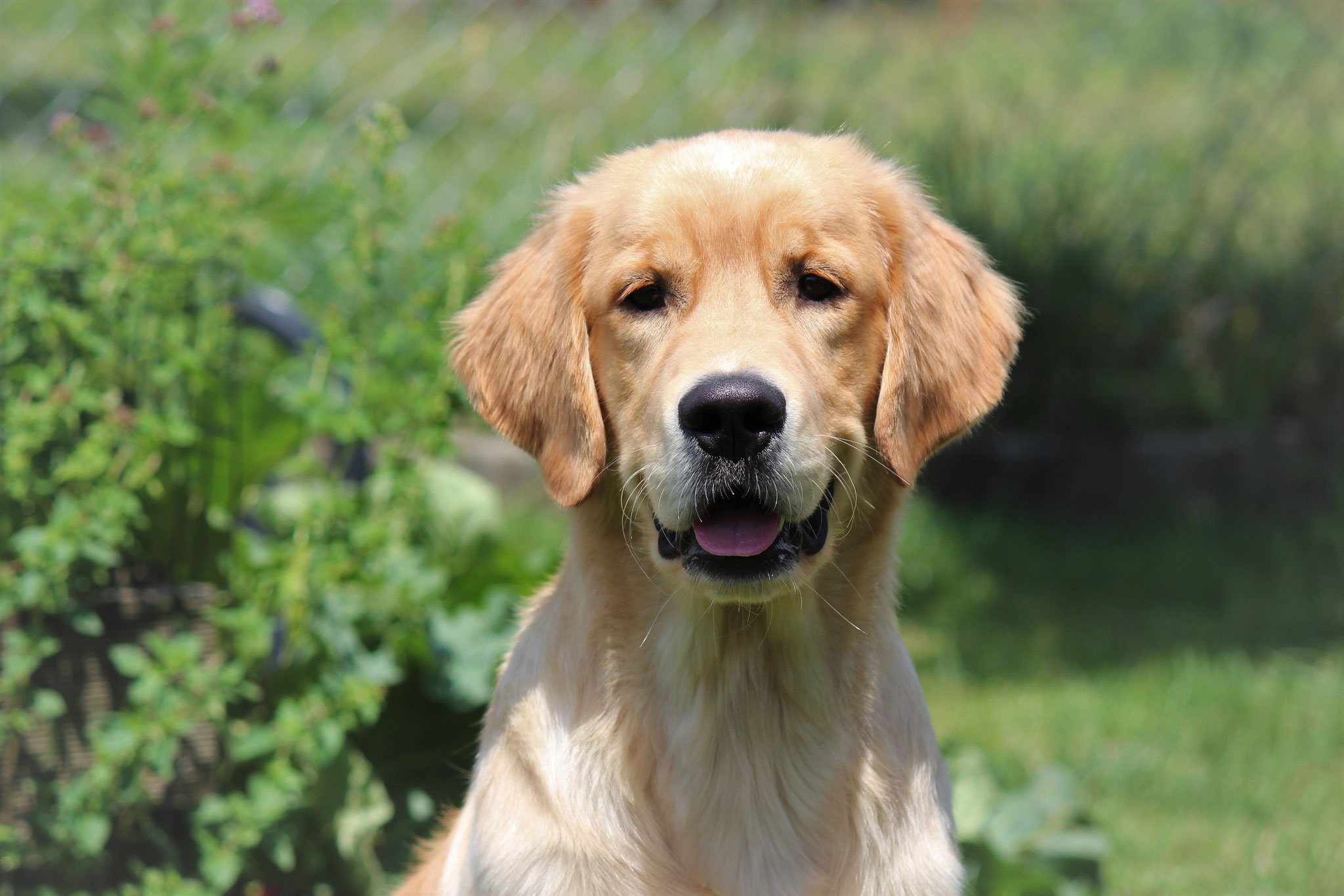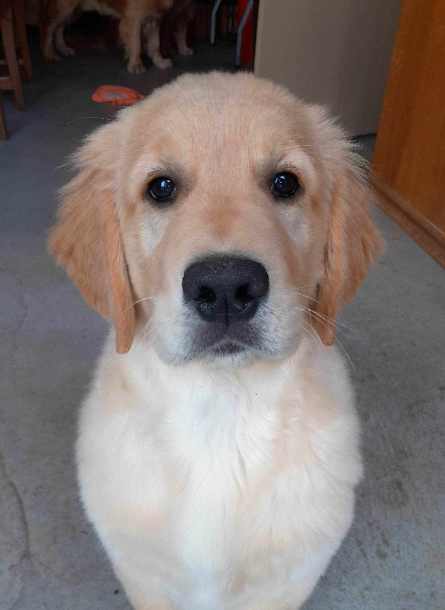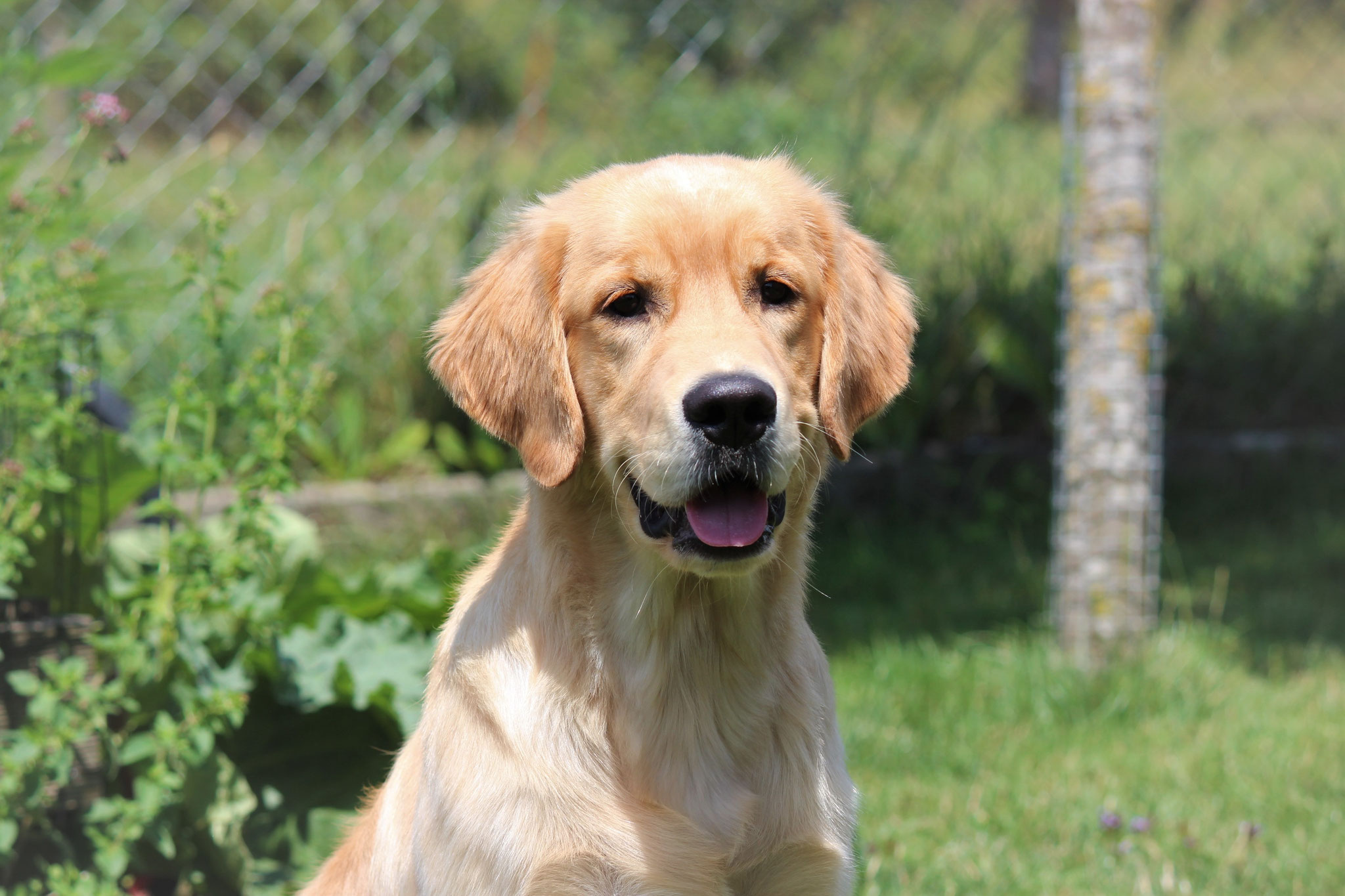 18 Monate alter goldfarbener grosser Rüde, maskuliner Kopf, breiter tiefer Fang, kräftiges Pigment, trockener Hals, ausgezeichnete Oberlinie, korrekte Rippenlage, tiefer Brustkorb, kräftige etwas lange Lende, gerade Läufe, sehr gute Knochenstärke, vorzügliche Winkelungen, aufmerksamer lebhafter Rüde in sehr gutem Haarkleid.