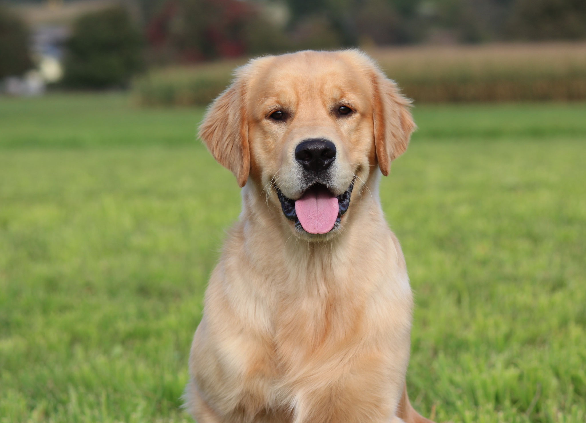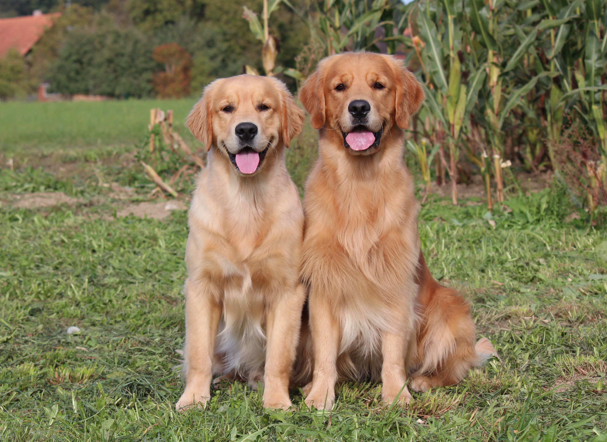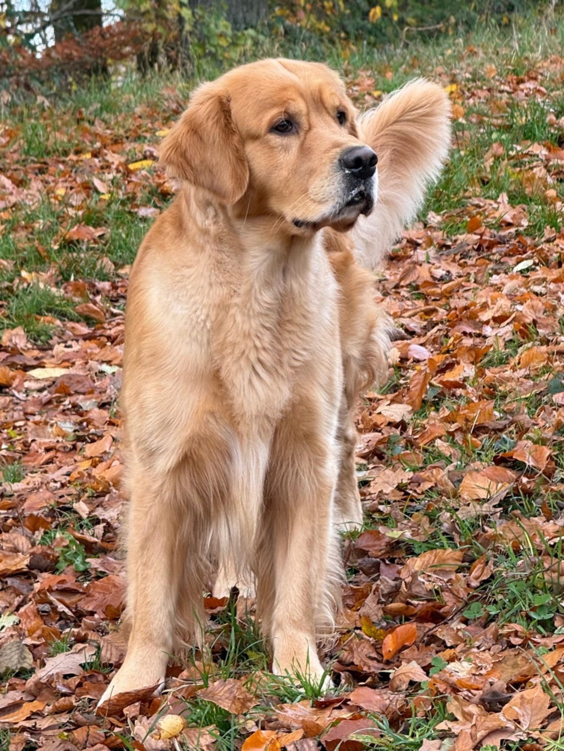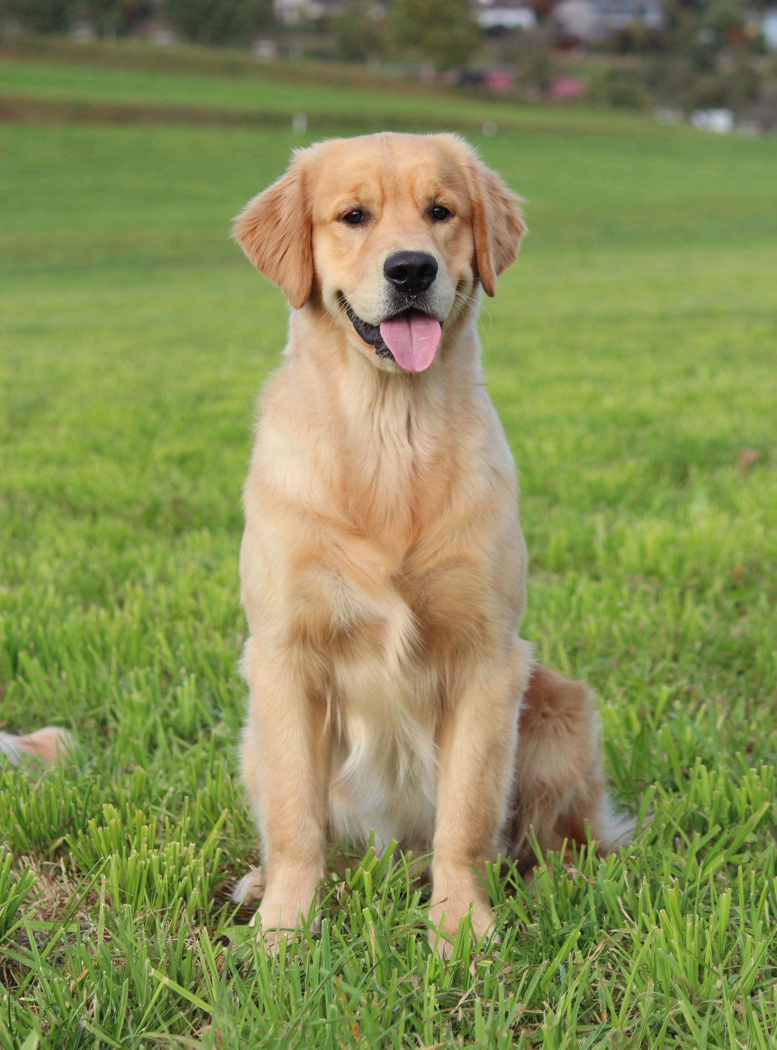 18 Monate alter goldfarbener grosser Rüde, maskuliner Kopf, breiter tiefer Fang, kräftiges Pigment, trockener Hals, ausgezeichnete Oberlinie, korrekte Rippenlage, tiefer Brustkorb, kräftige etwas lange Lende, gerade Läufe, sehr gute Knochenstärke, vorzügliche Winkelungen, aufmerksamer lebhafter Rüde in sehr gutem Haarkleid.