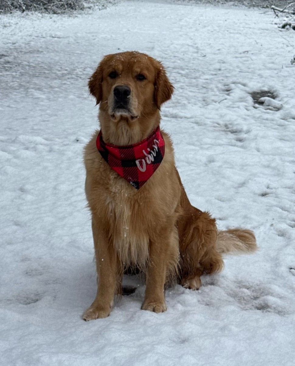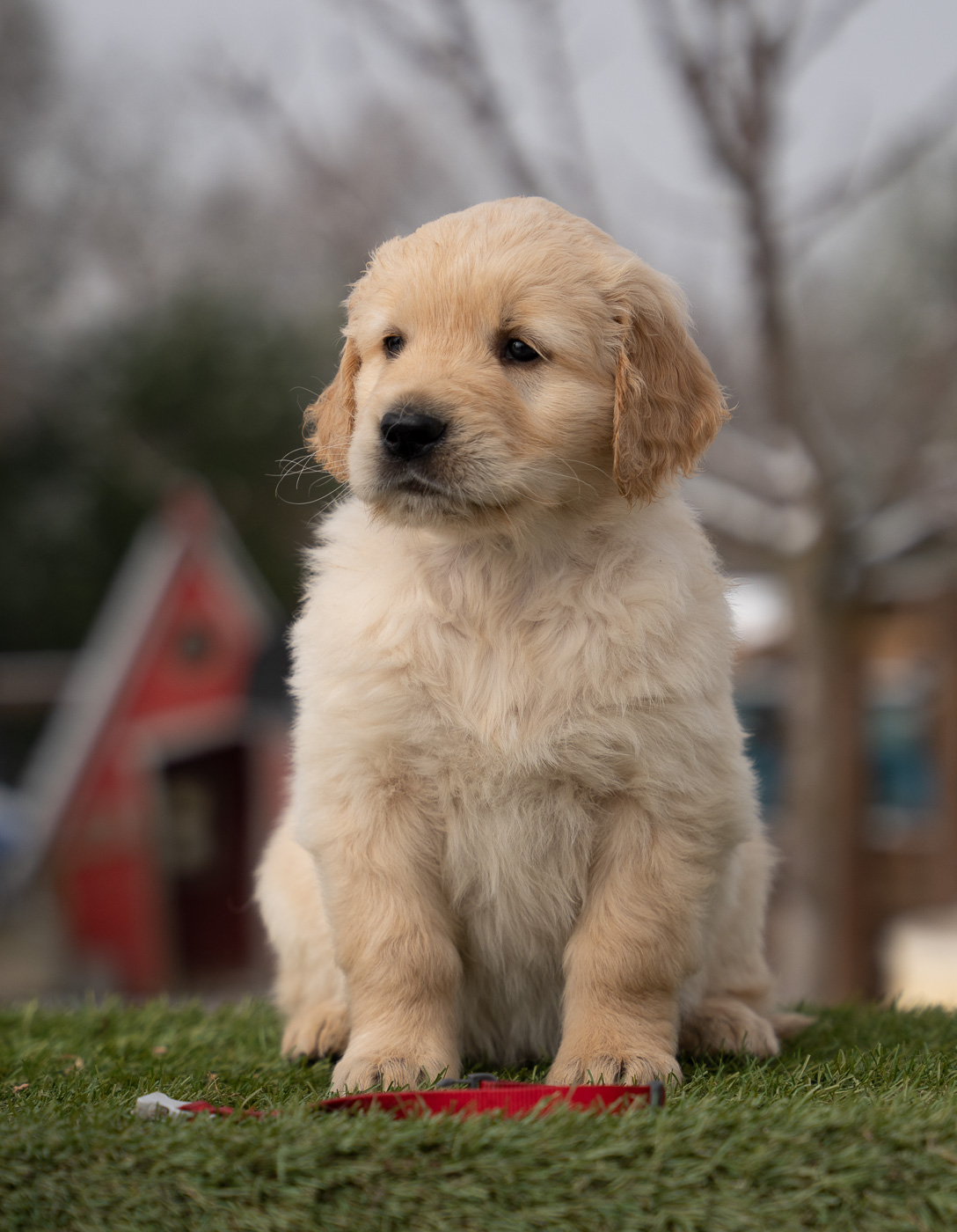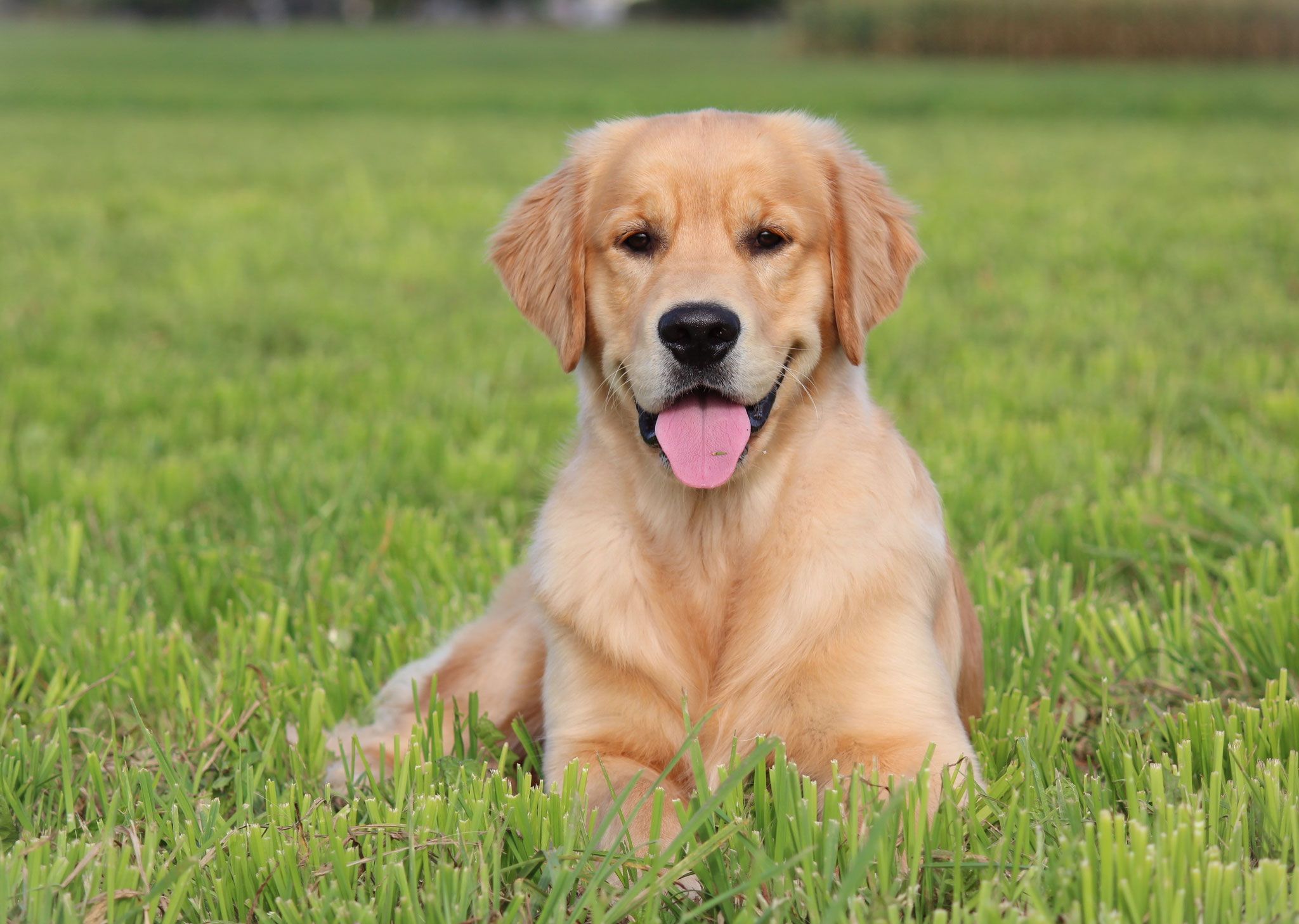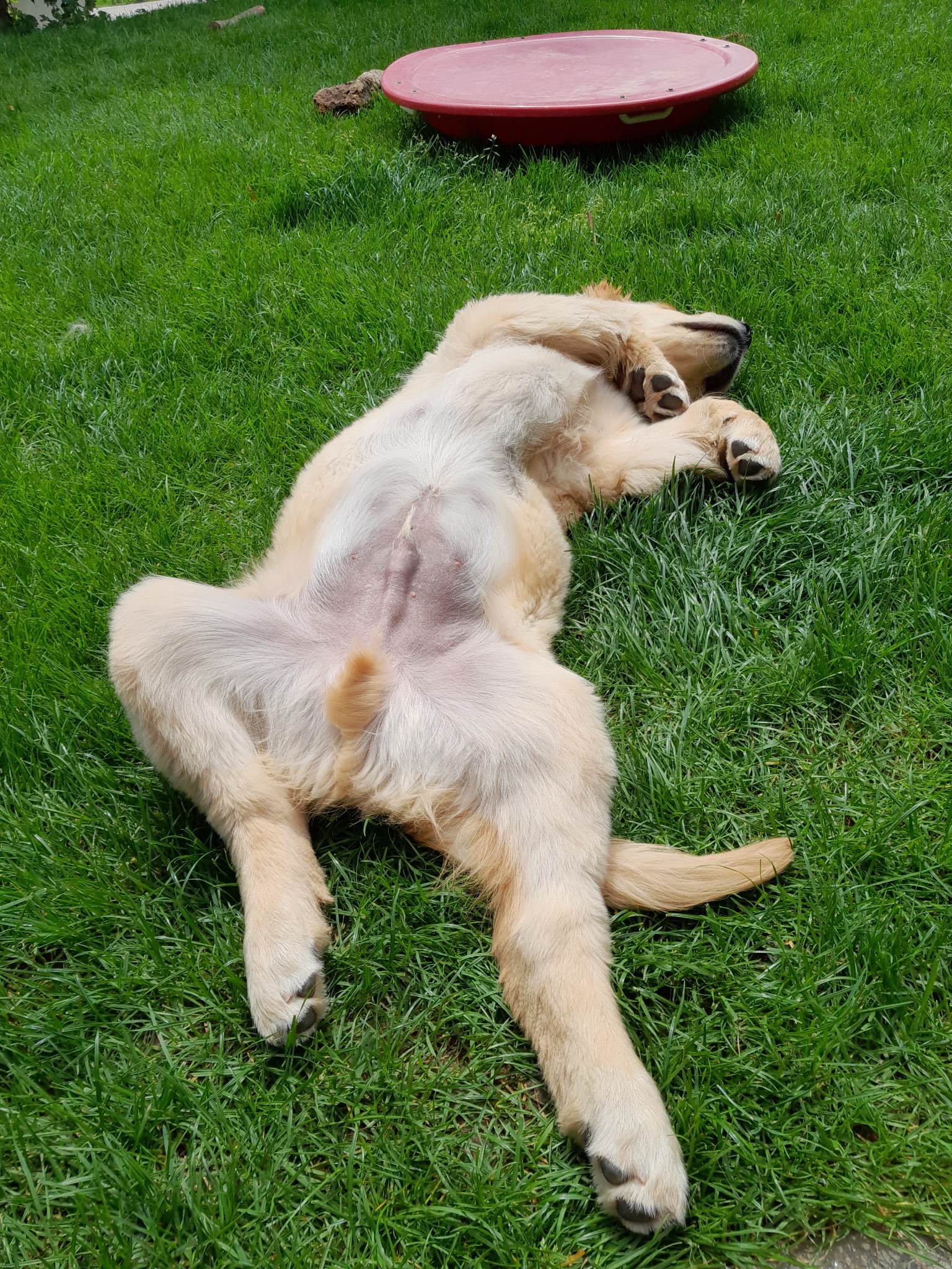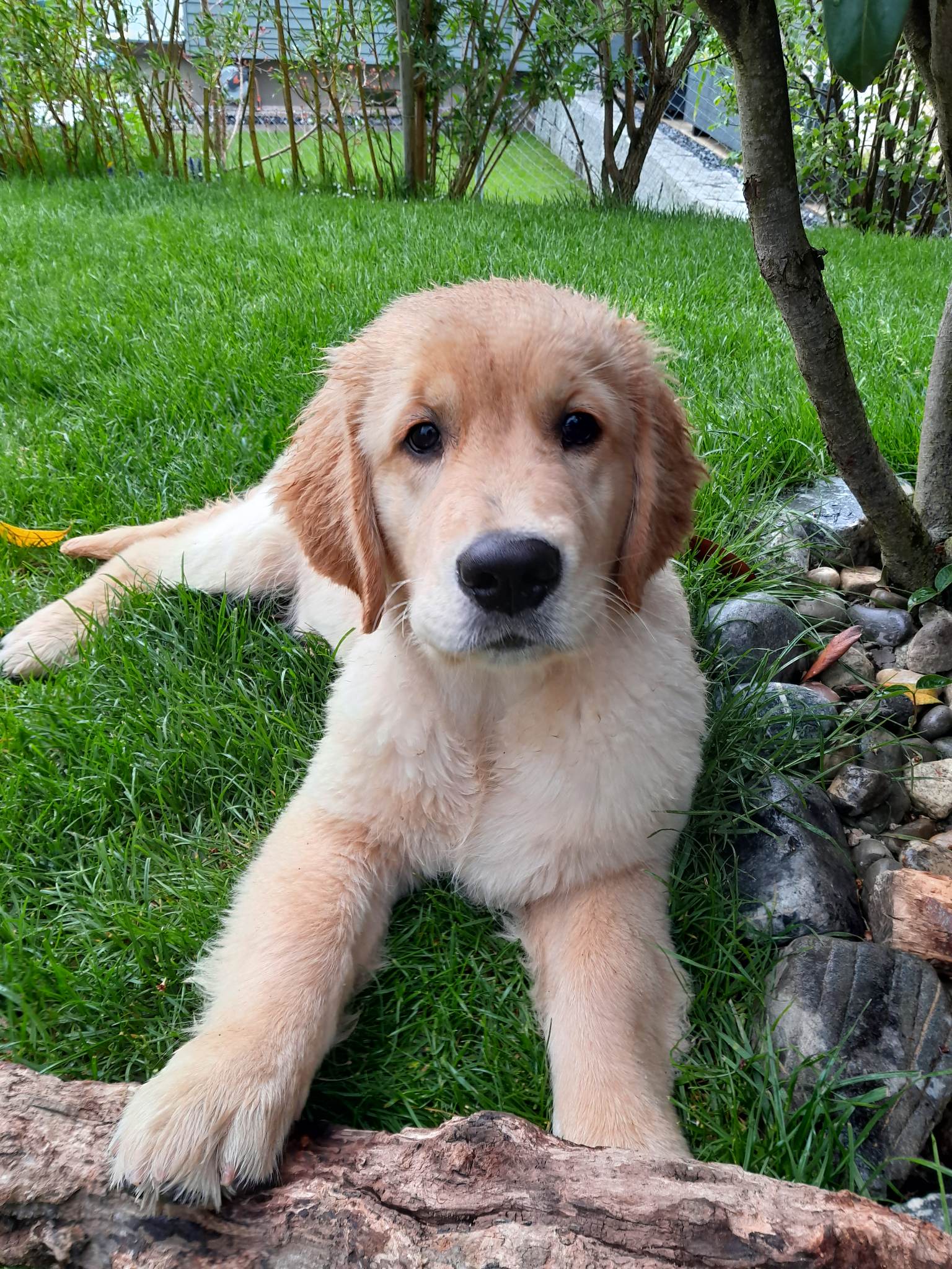 18 Monate alter goldfarbener grosser Rüde, maskuliner Kopf, breiter tiefer Fang, kräftiges Pigment, trockener Hals, ausgezeichnete Oberlinie, korrekte Rippenlage, tiefer Brustkorb, kräftige etwas lange Lende, gerade Läufe, sehr gute Knochenstärke, vorzügliche Winkelungen, aufmerksamer lebhafter Rüde in sehr gutem Haarkleid.